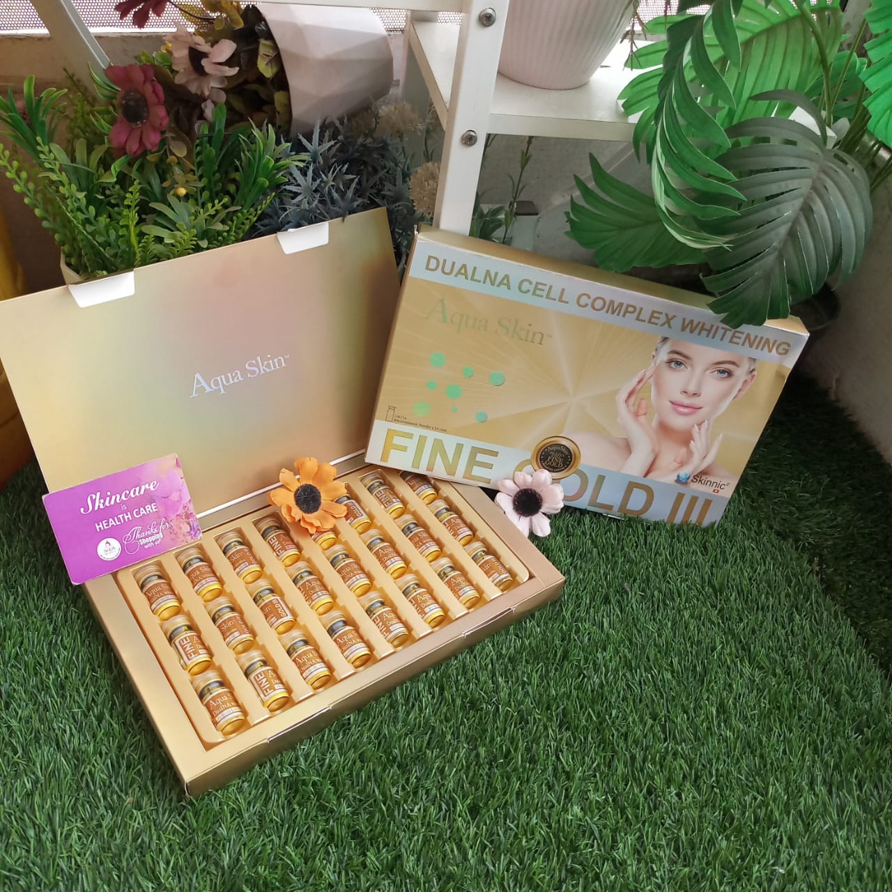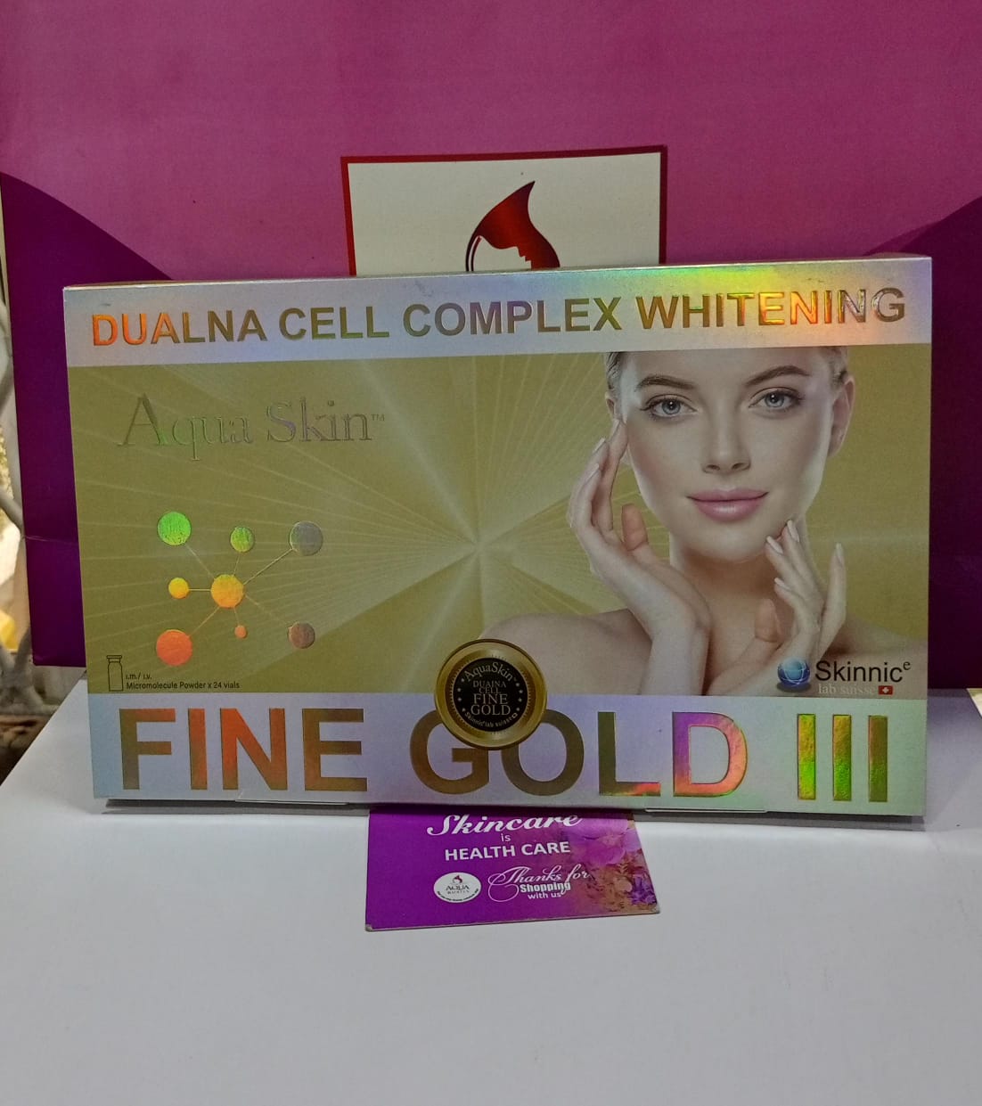 Aqua Skin Fine Gold III is a premium Swiss skin whitening and anti-aging formula that brightens skin, fades pigmentation, evens out tone, boosts collagen, hydrates deeply, and gives you a glowing, youthful appearance with visible results in just a few sessions.